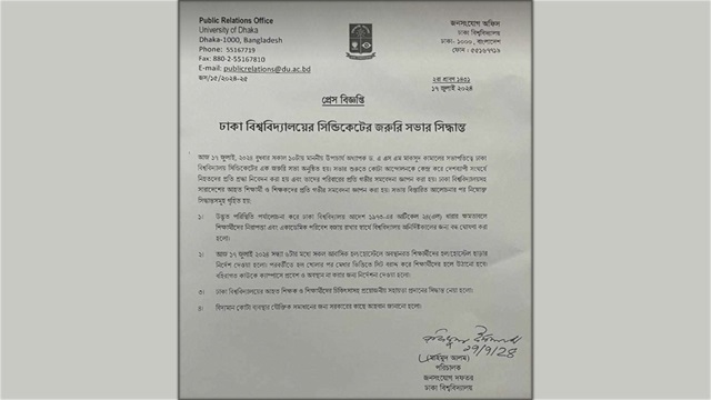 বুধবার (১৭ জুলাই) ঢাকা বিশ্ববিদ্যালয়ের সিন্ডিকেটের জরুরি সভায় এই সিদ্ধান্ত গ্রহণ করা হয়। পরে ঢাকা বিশ্ববিদ্যালয়ের জনসংযোগ দপ্তরের পরিচালক মাহমুদ আলম স্বাক্ষরিত বিজ্ঞপ্তিতে এই সিদ্ধান্ত জানানো হয়।