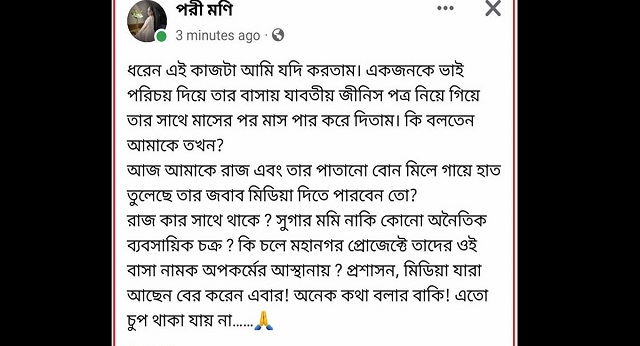 পরীমণি আরও লেখেন, ‘রাজ কার সঙ্গে থাকে? সুগার মাম্মি নাকি কোনো অনৈতিক ব্যবসায়িক চক্র? কি চলে মহানগর প্রোজেক্টে তাদের ওই বাসা নামক অপকর্মের আস্থানায়? প্রশাসন, মিডিয়া যারা আছেন বের করেন এবার! অনেক কথা বলার বাকি! এত চুপ থাকা যায় না।’