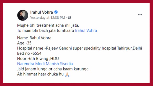 পোস্টে ভারতের প্রধানমন্ত্রী নরেন্দ্র মোদি ও দিল্লির উপমুখ্যমন্ত্রী মনীশ সিসৌদিয়াকে উল্লেখ করেছিলেন রাহুল। রাজীব গান্ধী সুপার স্পেশালিটি হাসপাতালে ভর্তি ছিলেন রাহুল।