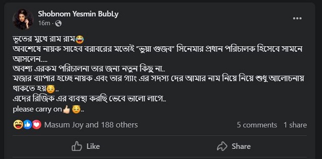 বুবলী তার স্ট্যাটাসে লিখেছেন, ‘ভূতের মুখে রাম রাম (নাম)। অবশেষে নায়ক সাহেব বরাবরের মতোই ‘ভুয়া গুজব’ সিনেমার প্রধান পরিচালক হিসেবে সামনে আসলেন। অবশ্য এ রকম পরিচালনা তার জন্য নতুন কিছু না। মজার ব্যাপার হচ্ছে নায়ক এবং তার গ্যাংয়ের সদস্যদের আমার নাম নিয়ে শুধু আলোচনায় থাকতে হয়। এদের রিজিকের ব্যবস্থা করছি ভেবে ভালো লাগে।’