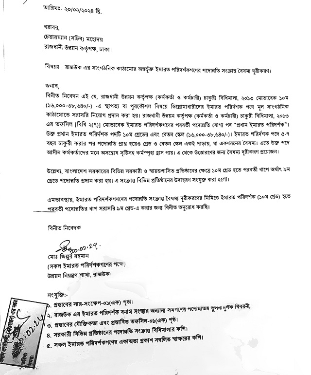 ইমারত পরিদর্শকদের পদোন্নতি সংক্রান্ত বৈষম্য দূরীকরণের নিমিত্তে ইমারত পরিদর্শক দশম গ্রেড হতে পরবর্তী পদোন্নতির ধাপ সরাসরি নবম গ্রেডে করার জন্য রাজউক চেয়ারম্যানের সুদৃষ্টি কামনা করেছেন এই কর্মকর্তা।
