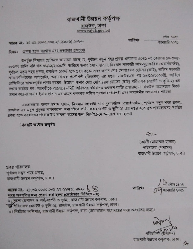 এদিকে পরিচালক এস্টেট ও ভূমি-২ এর দপ্তরে কর্মরত না থেকেও পূর্বাচল নতুন শহর প্রকল্প এলাকার ৩০৪১ নং কোডের ১০-৩০৫-০০৯ নং প্লটের নথিটি গত ১৩ ডিসেম্বর নিজে স্বাক্ষর করে গ্রহণ এবং নথিটি বহিরাগতের কাছে অসৎ উদ্দেশ্যে হস্তান্তর করার অপরাধে তত্বাবধায়ক প্রকৌশলী (ডিজাইন) এর দপ্তরের অফিস সহকারী কাম-কম্পিউটার অপারেটর মো. মোশাররফ হোসেন স্কাইকে কারণ দর্শানো নোটিশ প্রদান করা হয়েছে। রাজউক পরিচালক (প্রশাসন) কাজী মোহাম্মদ হাসান স্বাক্ষরিত নোটিশে (স্মারক নং-২৫.৩৯.০০০০.০০৯.২৭.২২০(৬).২০২০-৮৩) বলা হয়েছে, মোশাররফ হোসেন স্কাই এর এহেন কর্মকান্ড অফিস শৃঙ্খলার পরিপন্থী এবং রাজধানী উন্নয়ন কর্তৃপক্ষ (কর্মকর্তা ও কর্মচারী) চাকুরী বিধিমালা, ২০১৩ এর ৩৭ (খ) অনুযায়ী অসদাচরণ ও বিধি ৩৭ (চ) অনুযায়ী চুরি ও আত্মসাতের শামিল।