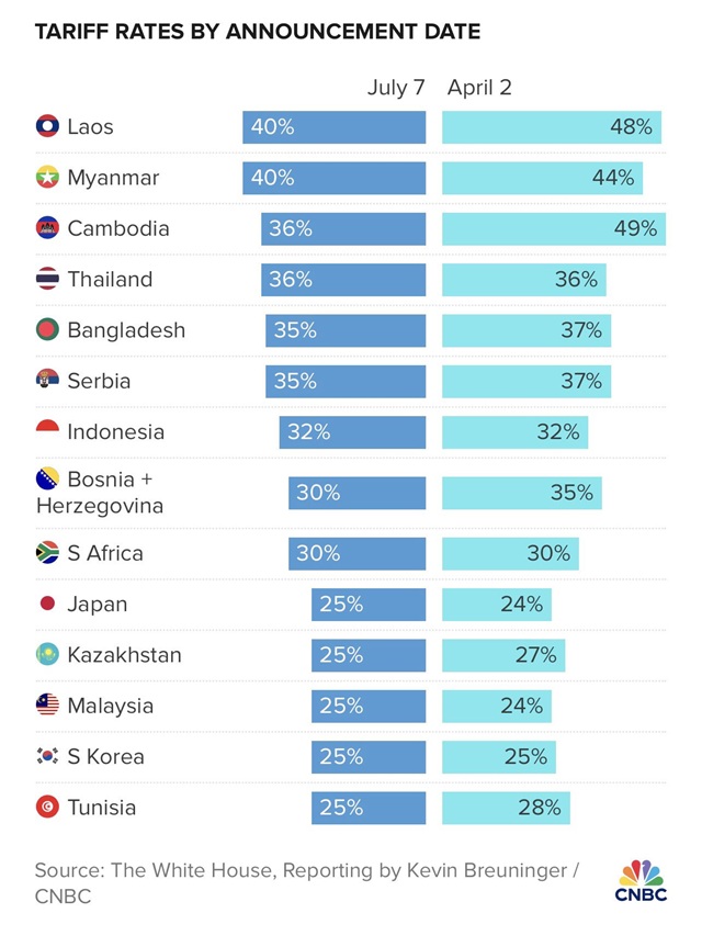 এসব দেশের মধ্যে জাপান, দক্ষিণ কোরিয়া, মালয়েশিয়া, কাজাখস্তান, তিউনিসিয়া’র ওপর ২৫ শতাংশ রপ্তানি শুল্ক আরোপ করা হয়েছে। পাশাপাশি দক্ষিণ আফ্রিকা ও বসনিয়া অ্যান্ড হারজেগোভিনার পণ্যের ওপর ৩০ শতাংশ, বাংলাদেশ ও সার্বিয়ার পণ্যের ওপর ৩৫ শতাংশ, ইন্দোনেশিয়ার পণ্যের ওপর ৩২ শতাংশ, কম্বোডিয়া ও থাইল্যাণ্ডের ওপর ৩৬ শতাংশ শুল্প আরোপ করা হয়েছে। সবচেয়ে বেশি শুল্ক জারি করা হয়েছে দক্ষিণপূর্ব এশিয়ার দুই প্রতিবেশী দেশ মিয়ানমার ও লাওসের ওপর—৪০ শতাংশ।