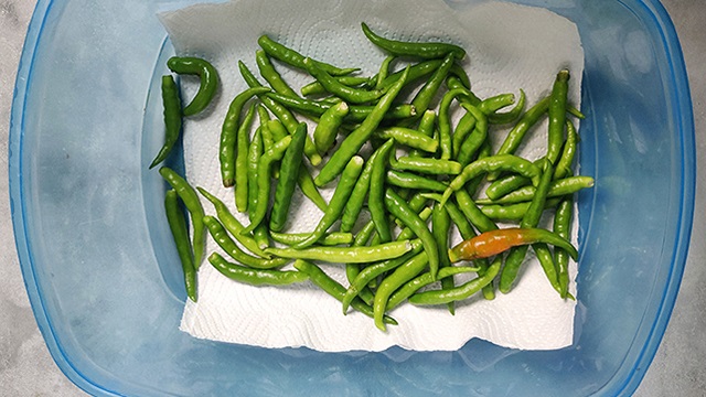 এয়ার টাইট বক্স থাকলে তাতে রাখুন কাঁচা মরিচ। রাখার আগে পাত্রের নিচে হালকা নরম কাপড় বা টিস্যু বিছিয়ে দেবেন। মরিচের বোঁটাগুলো ছিঁড়ে রাখুন। এতে কাঁচা মরিচ সহজে পচে না।