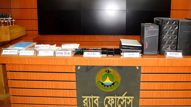এ সময় তাদের কাছ থেকে ৪টি কম্পিউটার, ৪টি ল্যাপটপ, ১৭টি মোবাইল ফোন, বিভিন্ন ব্যাংকের চেকবই, ভাউচার, চুক্তিনামা, প্যাড, সিল ও নগদ টাকা উদ্ধার করা হয়। অফিসে আটকে রাখা এক ভিকটিমকেও এসময় উদ্ধার করা হয়।