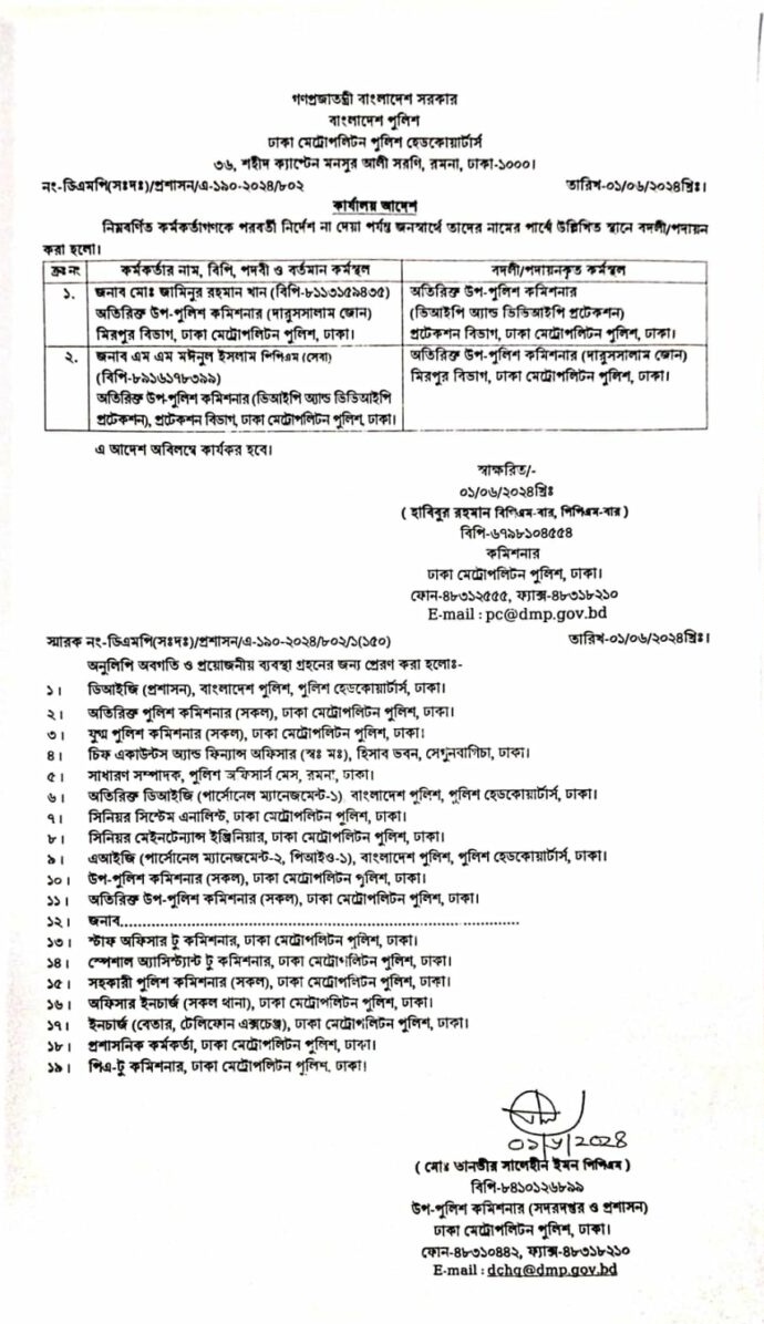 শনিবার (১ জুন) ডিএমপি কমিশনার হাবিবুর রহমান স্বাক্ষরিত এক আদেশে এই পদায়ন করা হয়।
