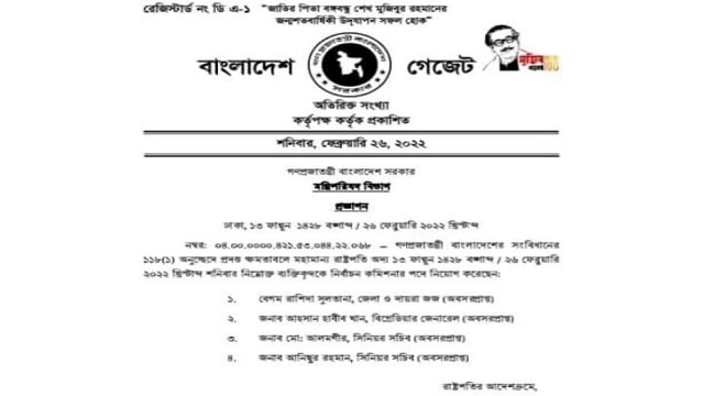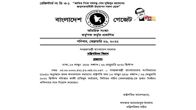 ২৬ ফ্রেব্রুয়ারি শনিবার এক সরকারী গেজেটে নতুন প্রধান নির্বাচন কমিশনার এবং অন্যান্য নির্বাচন কমিশনারদের নাম প্রকাশ করে মন্ত্রিপরিষদ বিভাগ। রাষ্ট্রপতির আদেশক্রমে এই গেজেট প্রকাশ করেন মন্ত্রিপরিষদ বিভাগের সচিব খন্দকার আনোয়ারুল ইসলাম। সংবিধানের ১১৮(১) অনুচ্ছেদ অনুযায়ি প্রদত্ত ক্ষমতাবলে ২৬ ফেব্রুয়ারি শনিবার নিয়োগ দেয়া হয় প্রধান নির্বাচন কমিশনার এবং অন্যান্য কমিশনারদেরকে।