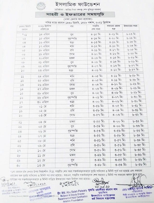 গত ১৩ মার্চ ইসলামিক ফাউন্ডেশন ১৪৪২ হিজরির রমজান মাসের সেহরি ও ইফতারের এ সময়সূচি চূড়ান্ত করে। সময়সূচিতে উল্লেখ করা হয়েছে, আগামী ১৪ এপ্রিল প্রথম রমজানে ঢাকায় সেহরির শেষ সময় ভোর ৪টা ১৫ মিনিট ও ইফতারির সময় ৬টা ২৩ মিনিট।