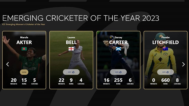 বিভিন্ন ক্যাটাগরির এই তালিকায় একেবারেই শেষে দেখা যাবে Women Emenging Cricketer of the Year 2023 অংশটি। তাতে ক্লিক করলেই আসবে চারজনের নাম। সেখানে মারুফার ছবিতে ক্লিক করলেই হয়ে যাবে ভোট প্রদান।