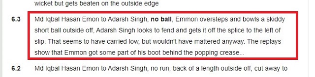 তবে ক্রিকেট ভিত্তিক ওয়েব সাইট ক্রিকবাজের তথ্য অনুসারে, আম্পায়ার ওভারস্টেপসের জন্য নো বল দিলেও টেলিভিশন রিপ্লেতে দেখা যায় তার বুট পপিং ক্রিজের অনেকটা ভেতরে ছিল। ফলে আম্পায়ারের বাজে সিদ্ধান্তে বৈধ বল করেও উইকেট থেকে বঞ্চিত হয়েছে টাইগার যুবারা।